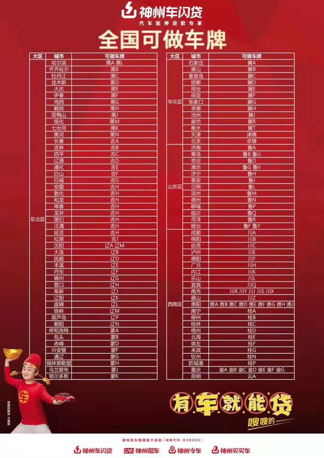 高评高放,不看车况神州车贷,家里有矿 全国180个城市都可以。没有社保,个人资质要求,只要你有登记证在手就来拿钱,评估8_12成。24期,利息1.36/% F36期,利息1.27% F全国汽车可做、无前置费用,无GPS费,欢迎过来喝茶13066888755